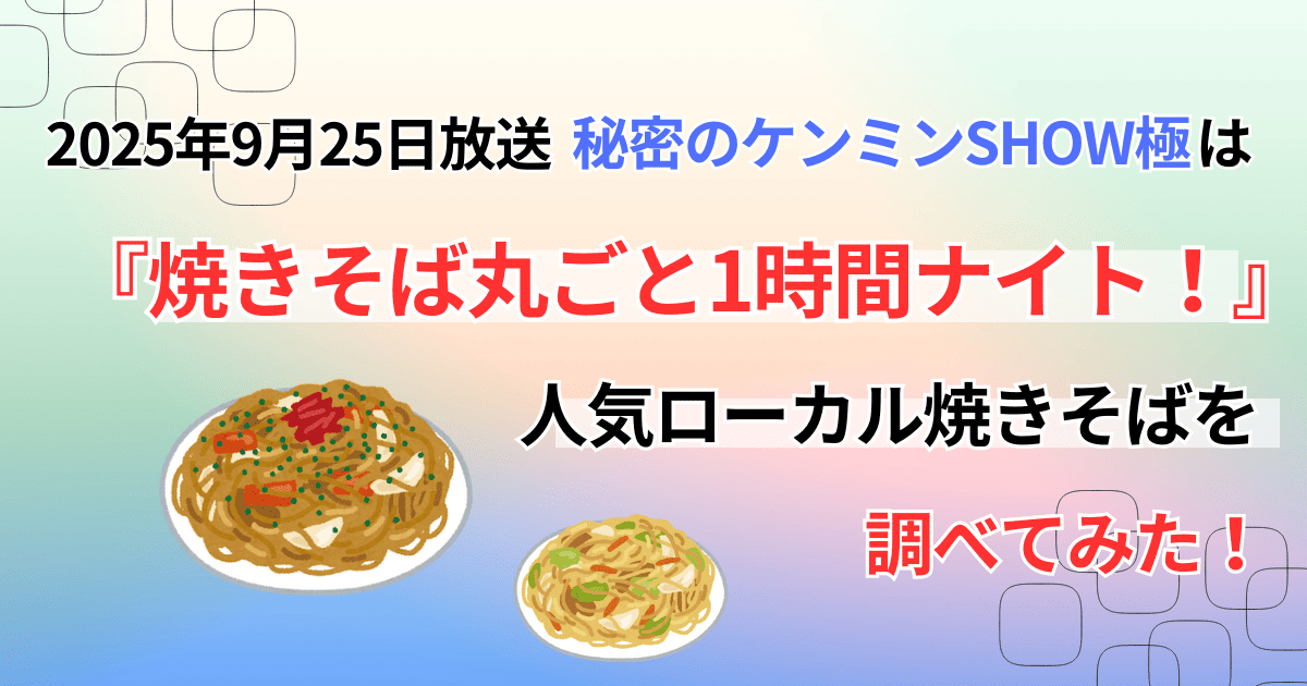 9月25日木曜21時から日テレで放送される『秘密のケンミンSHOW極』は、焼きそば丸ごと1時間ナイト!ということで、日本各地の人気ローカル焼きそばが地区ブロックごとに発表されるようです。