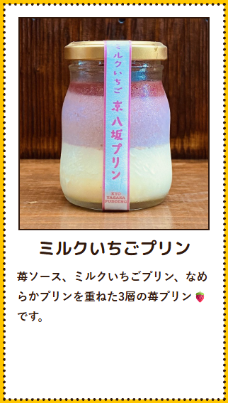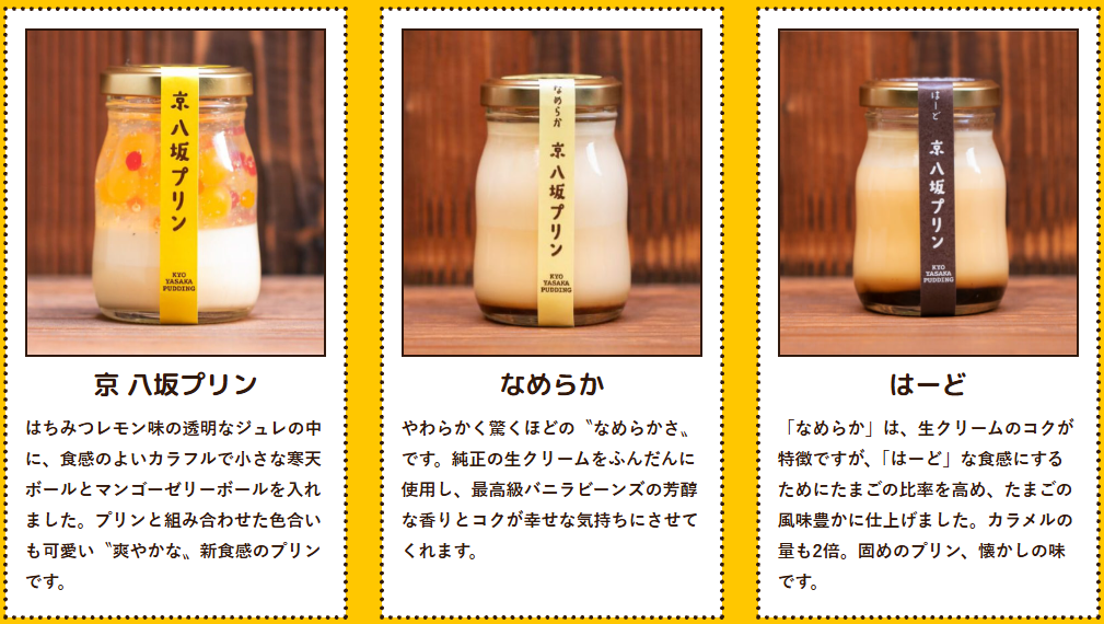 おそらく看板商品の「京八坂プリン」や「はーど」などの種類だと思われます。