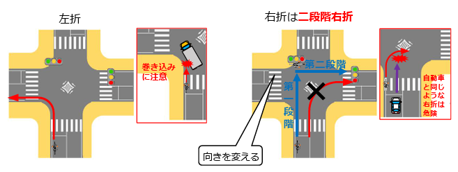 右折する際は、自動車のように曲がるのではなく、交差点の側端に沿って曲がる「二段階右折」をしなければなりません。