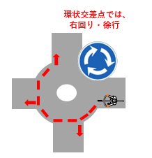 右回りに徐行して通行し、交差点内の車両を優先しなければなりません。