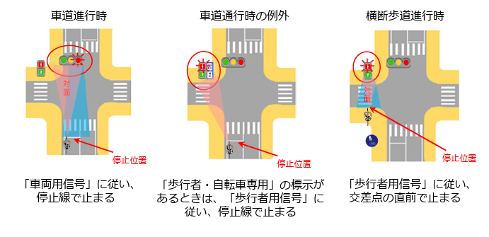 「歩行者・自転車専用」の標示がある場合や、横断歩道を通行する際は歩行者用信号に従う)。