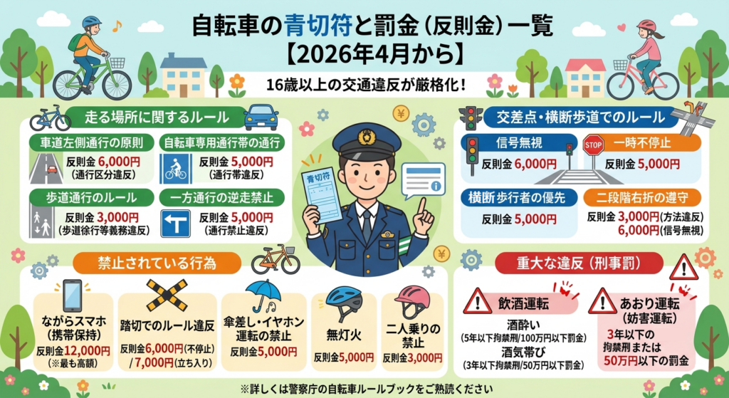 自転車のルールと青切符の罰金(反則金)金額まとめ【2026年4月から】