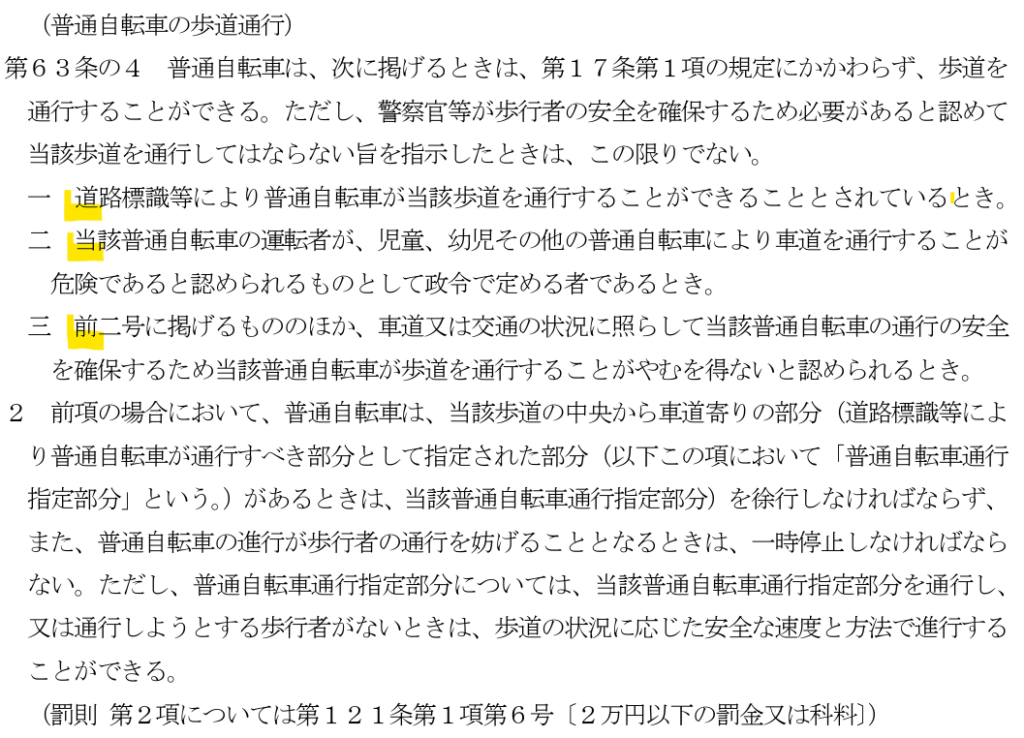 道路交通法第63条の4では、自転車が歩道を通行できる条件を明確に定めています。